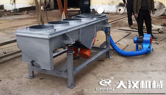 大漢機(jī)械風(fēng)冷式直線振動(dòng)篩這對高溫特性物料設(shè)計(jì)研發(fā),可在有效降低物料溫度后再對物料進(jìn)行篩分,有效的提高了篩分效率及處理量,下面以洗衣粉為例說明風(fēng)冷式振動(dòng)篩的應(yīng)用。洗衣粉在剛剛完成生產(chǎn)后,通常為120度左右的高溫,如不進(jìn)行降溫處理,篩選分級非常困難,而洗衣服不適合傳統(tǒng)的水冷式降溫。在洗衣粉生產(chǎn)線上用“大漢牌”風(fēng)冷式直線篩,剛生產(chǎn)完成120度高溫洗衣粉通過輸送設(shè)備直接進(jìn)入風(fēng)冷式長方形振動(dòng)篩,經(jīng)過安裝在設(shè)備進(jìn)料口底部的風(fēng)機(jī)降溫冷卻系統(tǒng),(不符合要求的結(jié)塊物料通過安裝在進(jìn)料口端的篩網(wǎng)篩選后從出料口旁的小型排料口排出,見下圖,該裝置可根據(jù)物料特性選裝),可直接將洗衣粉溫度降至40-50度后再進(jìn)入長方形振動(dòng)篩完成篩選分級工作。