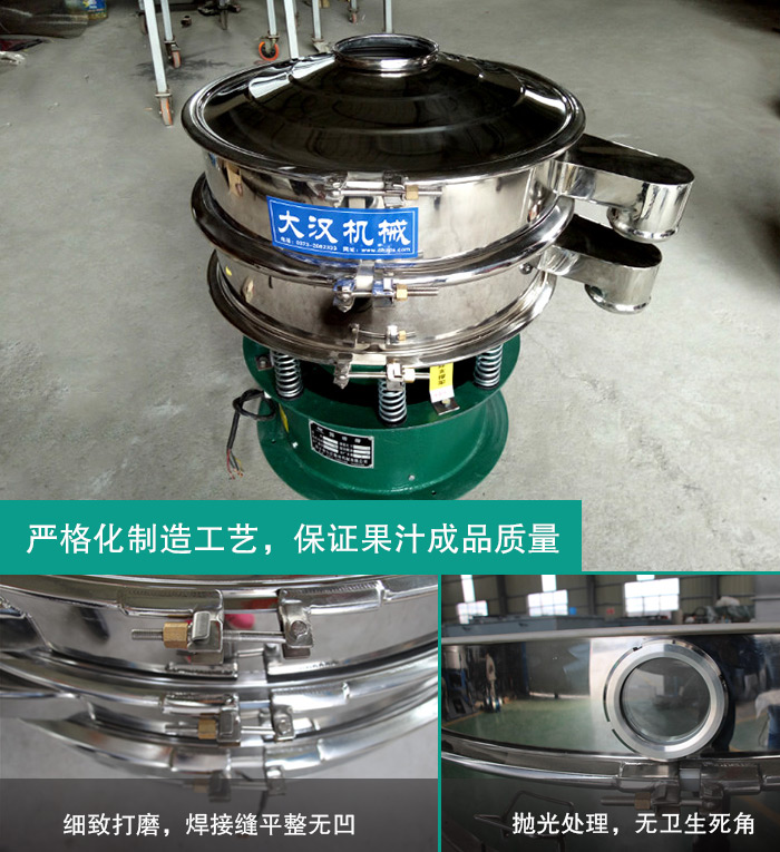 整機(jī)精選304不銹鋼材質(zhì),篩機(jī)全部進(jìn)行拋光處理,無衛(wèi)生死角,篩框的焊接處要求進(jìn)行打磨,焊接縫平整無凹點(diǎn),完全符合果汁行業(yè)對于衛(wèi)生的要求及標(biāo)準(zhǔn)。